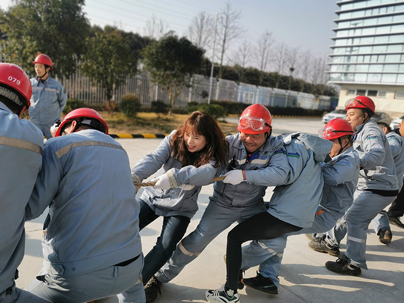 比賽前,有些隊伍商討戰術,有的做熱身準備,有的同事還拿出自備的搞怪面具;比賽中,隊員相互鼓勁加油,拉開“弓字步”,凝神聚氣,一觸即發;只聽裁判哨響,各個隊員緊握繩索,身子稍往后傾,咬緊牙關,使盡全身力氣將繩索往各自隊伍方向拉拽。由石總和安全總監戴總擔任此次拔河比賽的裁判員,還沒上場的其它隊員都成為了天然啦啦隊員,大家都漲紅了臉,拍打著手勢,為場上隊員加油鼓勁,氣勢絲毫不遜于參賽隊員,現場吶喊聲、加油助威聲此起彼伏。